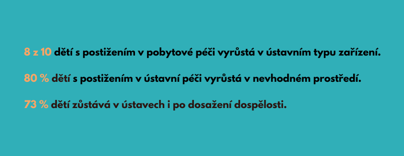 Přibližně 500 dětí se zdravotním postižením dnes v Česku vyrůstá mimo svou rodinu, vyplývá z analýzy Iniciativy 8000důvodů, která mapovala situaci na podzim 2024. Přestože se stát zavázal, aby děti v náhradní péči vyrůstaly v běžném prostředí, více než 80 % dětí se zdravotním postižením v Česku, které jsou umístěné ve státní pobytové péči, stále žije v objektech ústavního typu. Téměř 60 % dětí žije v ústavech v malých obcích, často bez dostupnosti speciálních škol a podpůrných služeb.